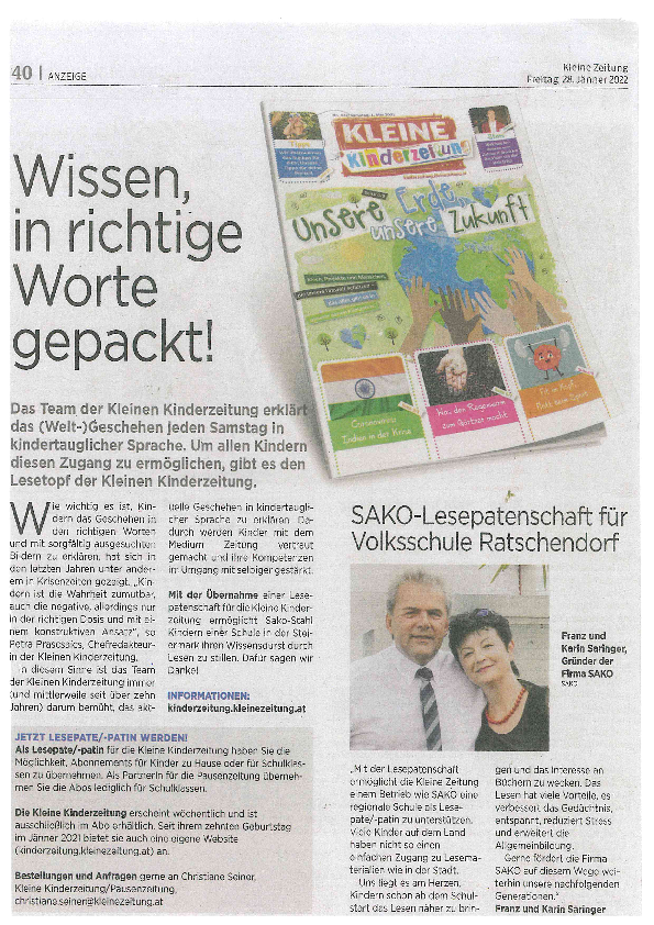 Die Firma Sako (Familie Saringer) hat eine Kleine-Kinderzeitung-Lesepatenschaft (50 Kinderzeitungen wöchentlich) für ein Jahr übernommen. Ein herzliches Dankeschön!