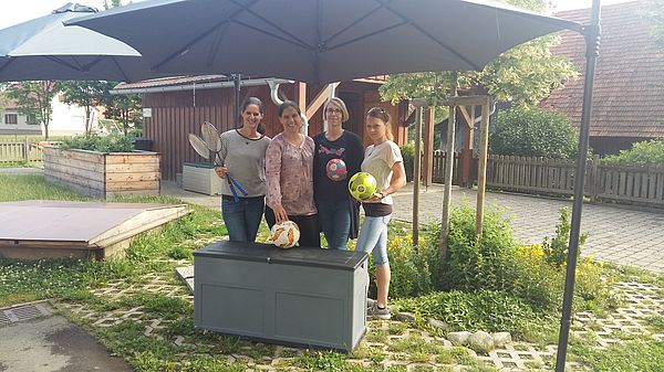 Der Elternverein hat die neuen Sonnenschirme und die Spielzeugkiste an Frau Direktor Scheiblhofer übergeben.